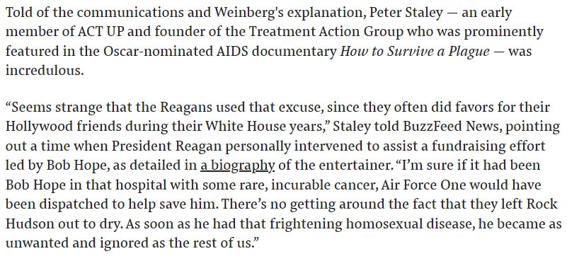 The Reagans were friends with Hudson from their days in Hollywood together, and he even attended a state dinner at the White House where he sat at Nancy’s table. Hudson was known as an “All-American” man and heartthrob for his roles in films like All That Heaven Allows (alongside Reagan’s first wife, Jane Wyman), Giant, and for starring alongside another symbol of American wholesomeness, Doris Day. He was also gay but kept his sexuality private for many years in order to maintain his career. Still, the fact was known privately among his friends in the industry. Hudson was diagnosed with AIDS in 1984. In 2015 it was revealed for the first time that Nancy Reagan refused a request for help from Hudson when he was attempting to receive treatment in Paris in 1985. The Mattachine Society uncovered the telegram sent from Hudson’s publicist to the White House in materials at the Reagan Presidential Library in a file simply labeled “Hospitals.”