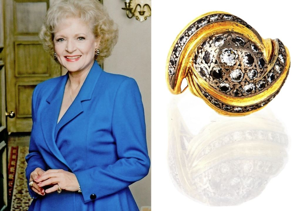 Allen gave this ring to Betty, probably in the late 60s, so it’s easy to see why she wore it almost constantly over the years. From promotional photos to magazine covers and episodes of The Golden Girls, this ring is emblematic of both Betty and Rose’s style.