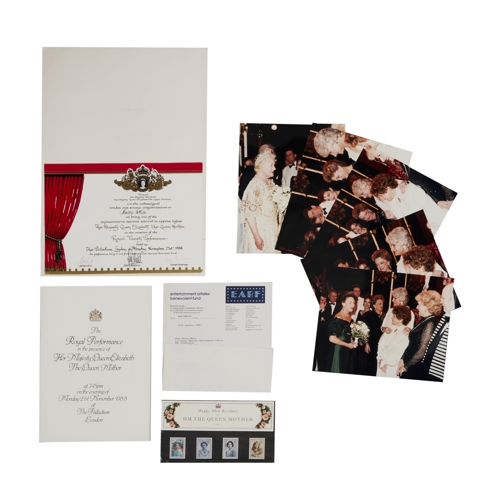 I expect that this lot might end up going for quite a bit more than the original estimate with the recent passing of Queen Elizabeth II. In 1988 the Girls performed in the presence of the Queen Mother as part of the Royal Variety Performance. The lot includes an event program, a certificate, and some commemorative stamps, but the real stars of the show are the behind-the-scenes photos of the Girls meeting the Queen Mother and Princess Margaret!