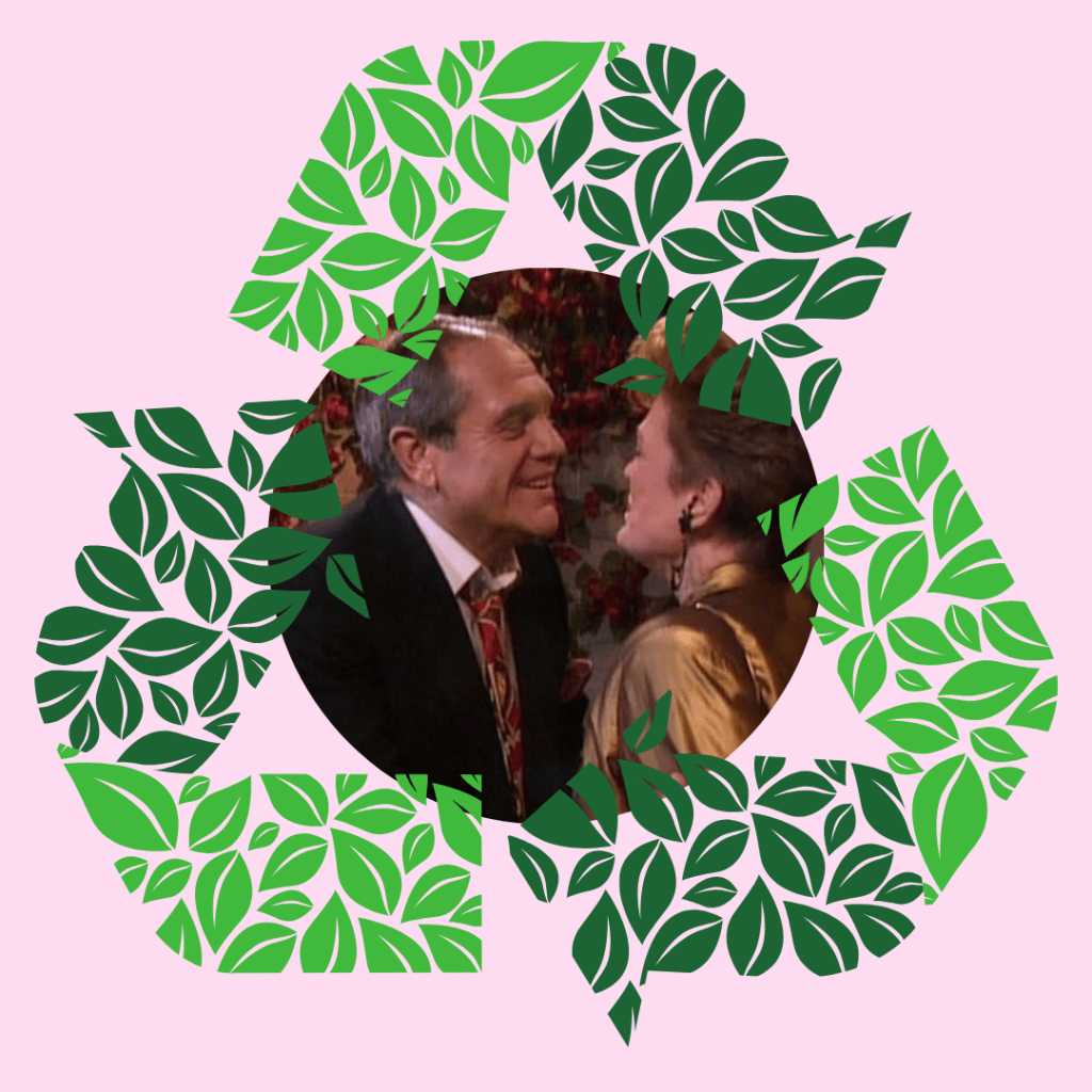 Set decorations like the infamous lobster mold tend to get all of the attention in the kitchen on The Golden Girls, but if you look carefully you’ll notice that the accessories on the bottom shelf of the baker’s rack were replaced with recycling baskets in the first episode of the seventh season! In the season’s fourth episode, “That’s For Me to Know,” we even see Rose stopping to sort an item into one of them. Of course, this is also the episode where Blanche wants to install a hot tub, so I guess conserving water didn’t make the environmentally conscious cut at 6151 Richmond Street. But we shouldn’t forget that she joined Rose in her Friends of the Sea Mammals protest in the “Love Under the Big Top” episode or Dorothy’s oft forgotten Save the Wetlands campaign in “72 Hours,” both from season five. In fact, both of those episodes aired just prior to The Earth Day Special, proving that the Girls were ahead of their time as always.