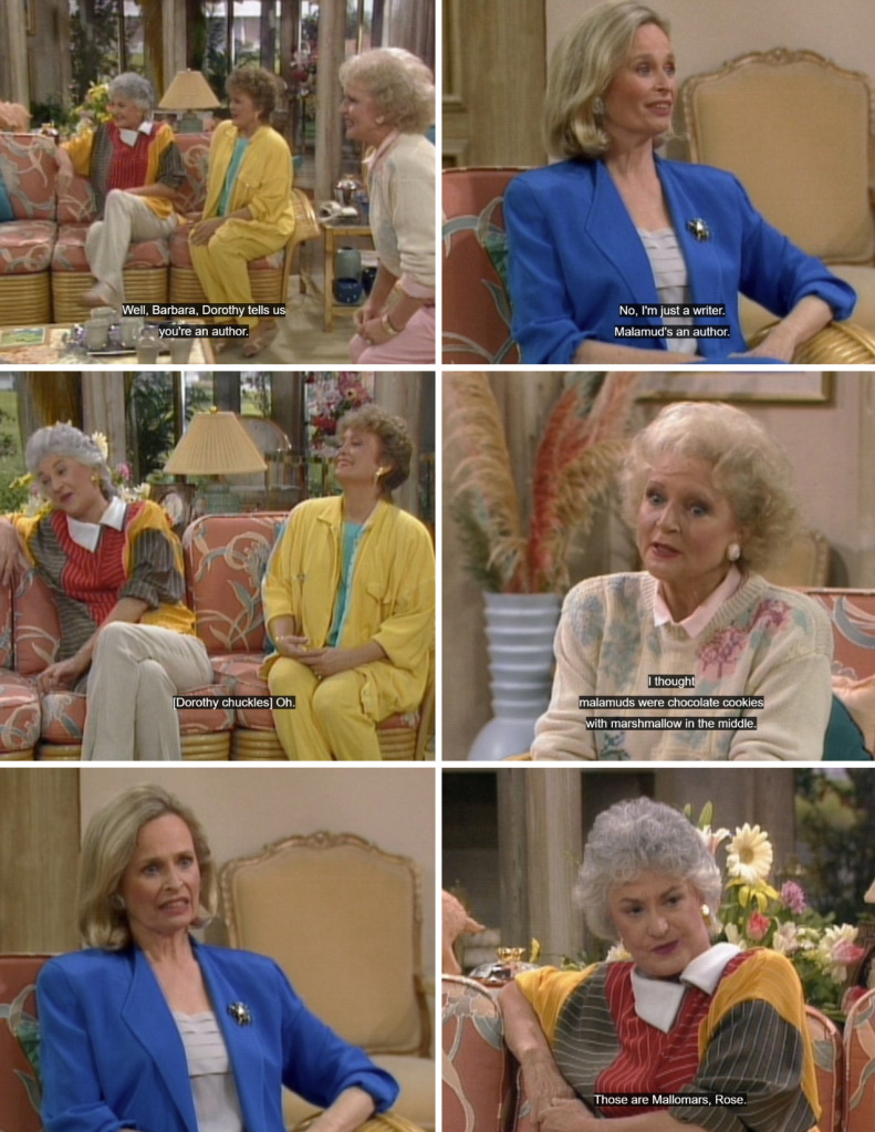 Rose mistaking Malamud for Mallomars is about as good a Rose moment as you can get. What makes both the writing and acting in this scene so brilliant is that you don’t even really have to know who or what either of those things is to laugh. The joke tells us, of course, but it’s all in the subtext. We understand right away that Barbara and Dorothy see themselves as being better than Blanche and Rose. They see themselves as part of the “literary intelligentsia” for knowing who Malamud is. There’s a little more under the surface here, though.