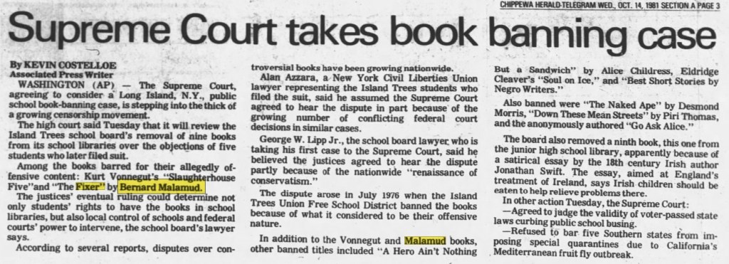 As it turns out, The Fixer was also part of the landmark Island Trees v. Pico Supreme Court case of 1982. Malamud’s novel about antisemitism in the Russian Empire portrays a fictionalized account of the Beilis Case of 1913 in which a Jewish man, Menahem Mendel Beilis, was wrongfully accused of murder and eventually acquitted. Along with eleven other books deemed “anti-American, anti-Christian, anti-Semitic, and just plain filthy” by the Island Trees Union Free School District of Long Island, New York it was removed from junior and high school libraries in the district in 1976. A group of five high school students led by Steven Pico and represented by the ACLU filed a lawsuit against the school board arguing a violation of their First Amendment rights. Although the court concluded that “school boards may not remove books from library shelves simply because they dislike the ideas contained in those books,” it was a split decision that ultimately left the scope of their ruling unclear. Unfortunately this has only contributed to the increased efforts of groups like Moms for Liberty to continue to ban books from schools today.